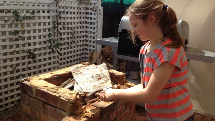 After measuring, inventing, sketching, measuring, walking around in circles and some more measuring and thinking I’d decided that it was all too hard and that the old BBQ had to go! I’d tried to save it to no avail, and with the entire area needing a re-model it was time to consult the sledgehammer of destiny. The kids were excited, an opportunity for parent sponsored destruction – bring it! The only rules were, don’t kill each other and you can…
